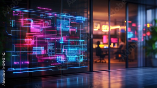 Glass wall featuring neon colored pattern with vibrant illuminated design elements and textures