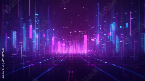 Glitch neon loading. Cyberpunk futuristic concept. Purple and blue glowing lights on dark pixel background. Creative design with color lines. Neon effect. Vector illustration