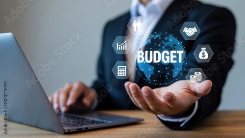 Global Budget Management: A business professional holding a glowing world globe with "BUDGET" and financial icons, illustrating strategic financial planning and international resource allocation