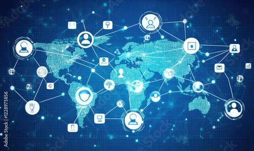 Global Digital Network Map with Connected Icons and Data Links