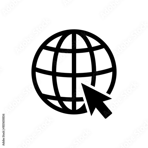Global internet icon with pointer arrow, symbolizing worldwide web access, online navigation, and digital communication interface