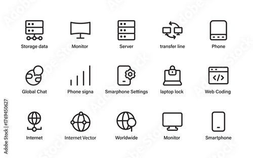 Global network and device connectivity icon collection. featuring server, smartphone, internet, chat, and storage.