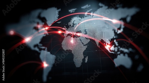 Global network connected by red glowing lines showing worldwide communication, business, and internet, exchange data