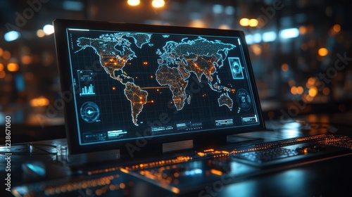 Global network map displayed on a computer screen.