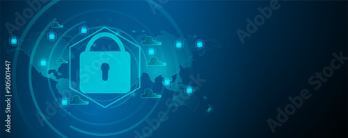 Global network security concept. Padlock, data and information privacy. Blue digital technology background