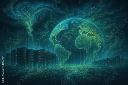 Global network visualization with data streams forming weather patterns affecting digital infrastructure