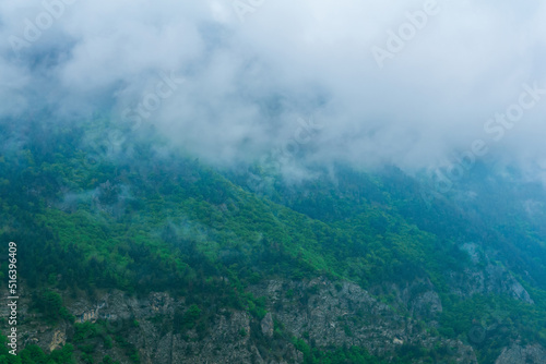 gloomy mountain landscape, wooded slopes covered with rain clouds