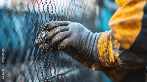 Gloved hand grips chain link, yellow sleeve showing, industrial work environment. Image symbolizes labor, construction, safety, or blue-collar industries.