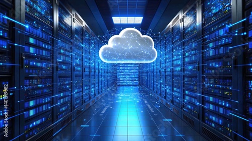 Glowing 3D cloud icon with digital connections inside a futuristic blue server room. Ideal for cloud computing, data storage, network security, and IT infrastructure visuals