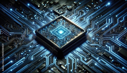 Glowing AI Microchip on Electronic Circuit Board: Futuristic Visualization Representing Machine Learning, Neural Networks, Data Flow, and Advanced AI Processing in Digital Technology