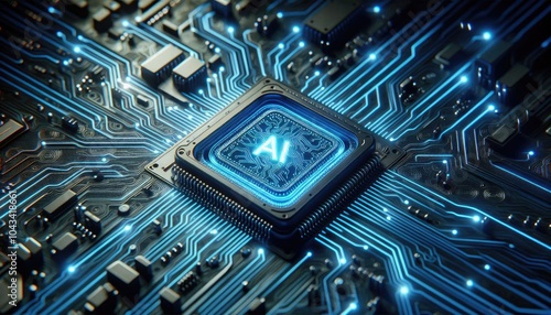 Glowing AI Microchip on Electronic Circuit Board: Futuristic Visualization Representing Machine Learning, Neural Networks, Data Flow, and Advanced AI Processing in Digital Technology