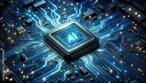 Glowing AI Microchip on Electronic Circuit Board: Futuristic Visualization Representing Machine Learning, Neural Networks, Data Flow, and Advanced AI Processing in Digital Technology