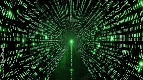 Glowing binary code streams flowing in a digital pattern across a dark tech-inspired background symbolizing data movement and cyber technology Large space for text in center Stock photo with copy