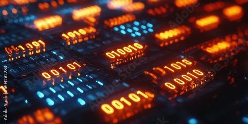 Glowing binary data chips on motherboard