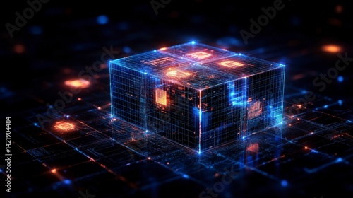 Glowing blue and orange cube on a dark circuit board background. Digital art, abstract concept.