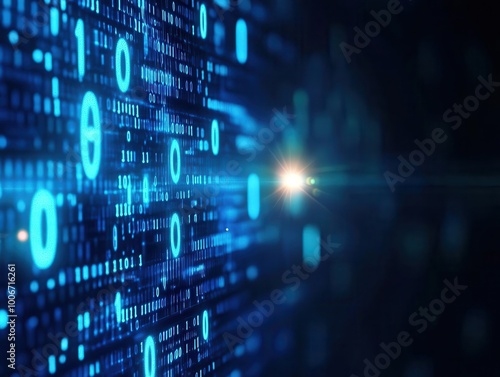 Glowing blue binary code on a computer screen, abstract pattern with sharp focus on data Depth effect, futuristic lighting, wideangle shot capturing the digital flow