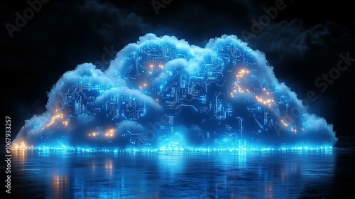 Glowing Blue Circuit Board Cloud Reflecting in Water
