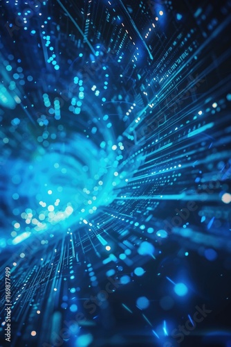 Glowing blue circuit board with numerous fine wires, representing advanced technology and data transfer.