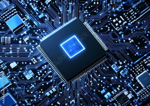 Glowing Blue CPU Chip on Dark Circuit Board