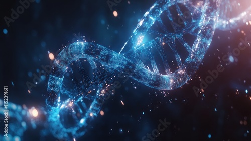 Glowing blue DNA helix structure abstract background.