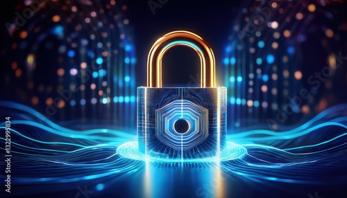 Glowing blue holographic padlock against a dark background representing advanced data encryption security