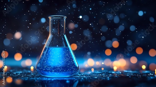 Glowing blue liquid in laboratory flask against dark background with bokeh lights and water droplets creates magical scientific atmosphere.