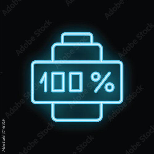 Glowing blue neon battery icon indicating a full charge against a dark backdrop