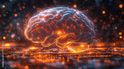 Glowing brain with swirling patterns symbolizes machine intelligence data processing and artificial brainpower merging human thought with advanced algorithms in a digital future concept