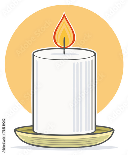 Glowing Candle Illustration on Dish with Fiery Flame Light in Yellow Circle