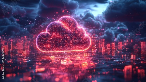 Glowing Cloud Computing Over Futuristic Cityscape Red and Blue Illustration
