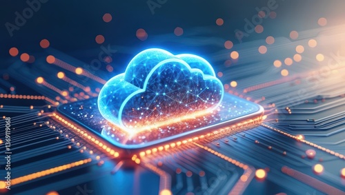 Glowing Cloud Computing Symbol With Circuit Board Pattern, Representing Technology, Data Storage, And Digital Transformation In A Futuristic Cyber Network.