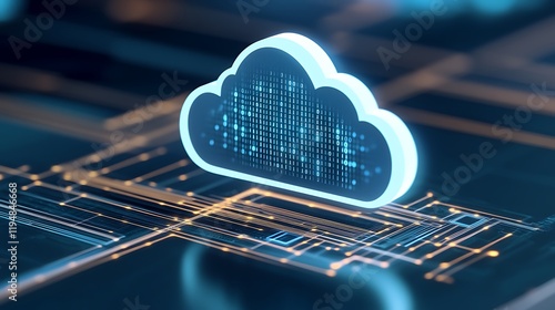 Glowing Cloud Icon on Digital Circuit Board Background with Data Connections and Technology Visuals