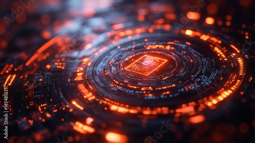 Glowing computer chip surrounded by data circuits with dynamic red illumination, high tech network infrastructure elements on a transparent background, PNG image, PNG file.