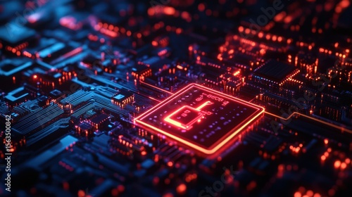 Glowing CPU chip on circuit board, data processing, digital background, tech concept