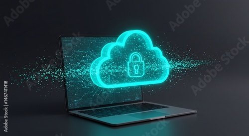 Glowing Cyan Cloud Security Icon Above Laptop