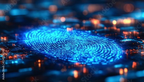 Glowing digital fingerprint representing security in a modern business technology background
