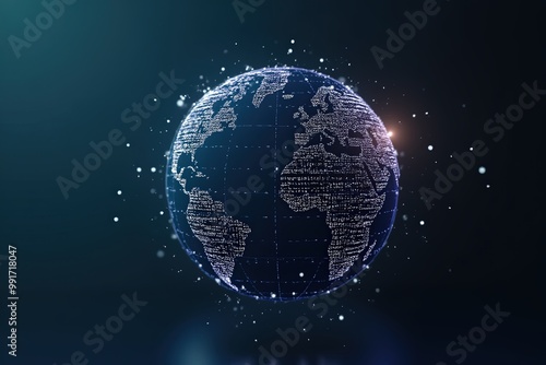 Glowing digital globe with data points and network connections on dark background.