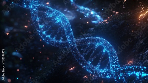 Glowing DNA helix structure in dark space.