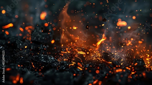 glowing embers and floating ashes on black background fireplace concept