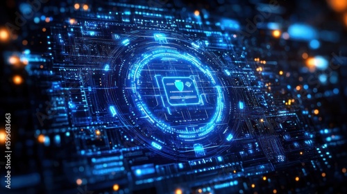Glowing futuristic digital interface with circular holographic display and complex circuit patterns in blue light