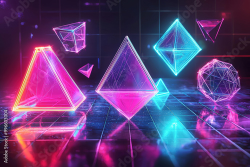 Glowing geometric shapes in vibrant colors create captivating visual display. neon hues of pink and blue illuminate scene, enhancing futuristic atmosphere