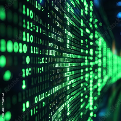 Glowing green binary code streaming down a black screen, representing programming and data encoding.