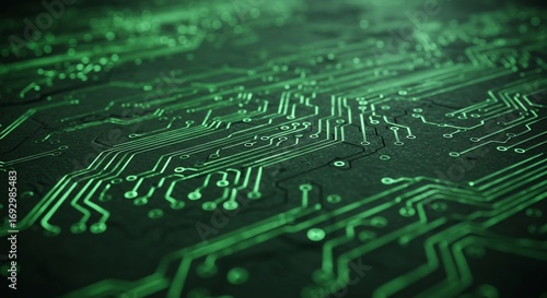 Glowing Green Circuit Board Closeup Abstract Technology