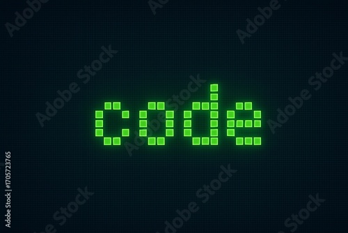 Glowing Green Pixel Typography Code Digital Grid Background.