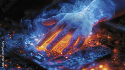 glowing hand hovers over circuit board, symbolizing fusion of technology and human interaction. vibrant blue and orange colors highlight innovation and energy