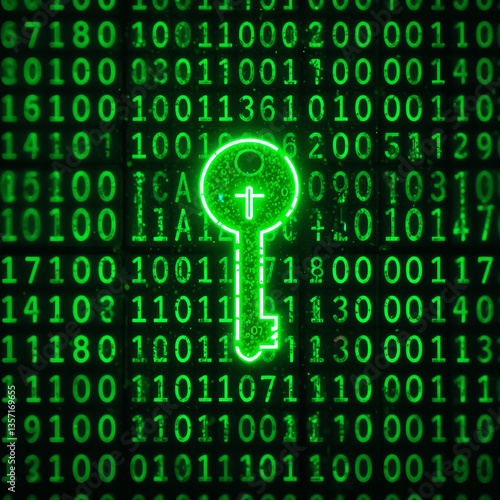 Glowing Key Symbol Against Green Digital Binary Code Backdrop