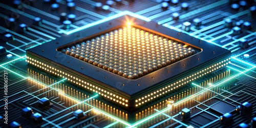 Glowing LED lights surrounding a processor, indicating activity and performance levels, technology, processor