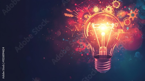 Glowing Lightbulb with Abstract Background of Gears, Stars, and Lines