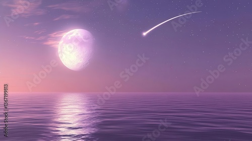 Glowing Moon Over Icy Blue Ocean Under Starry Sky at Twilight with a Shooting Star