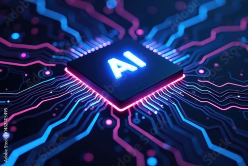 Glowing Neon AI Chip with Blue and Purple Circuit Pathways